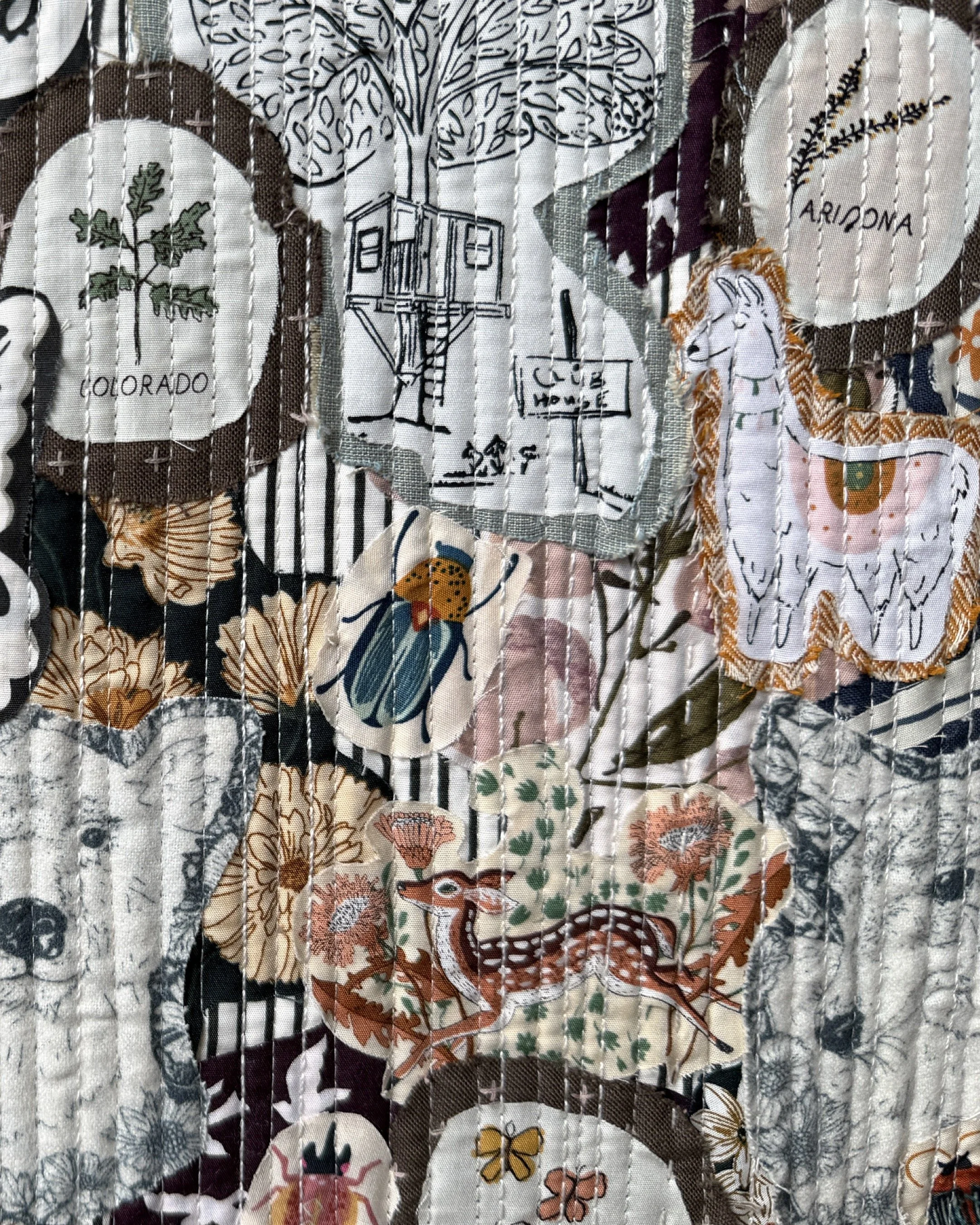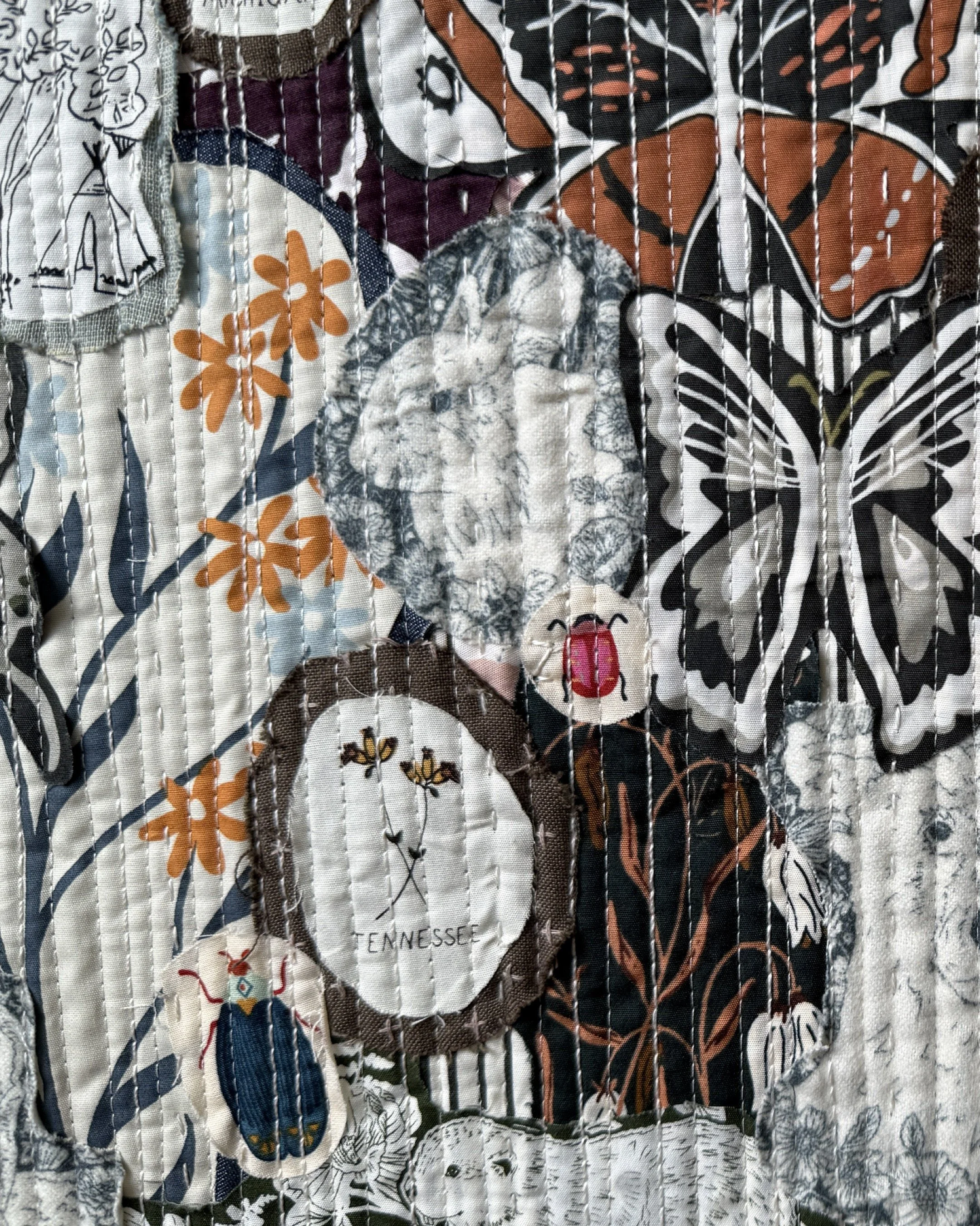 The quilting secures the fabric pieces in place. I used one-direction matchstick quilting with my walking foot (or similar) no marks, no lines, just free stitching. I left small openings to add three different thread weights, including hand stitches, for extra texture and personality.Aurifil thread used: Color 2311, weight 8, 12, 50.