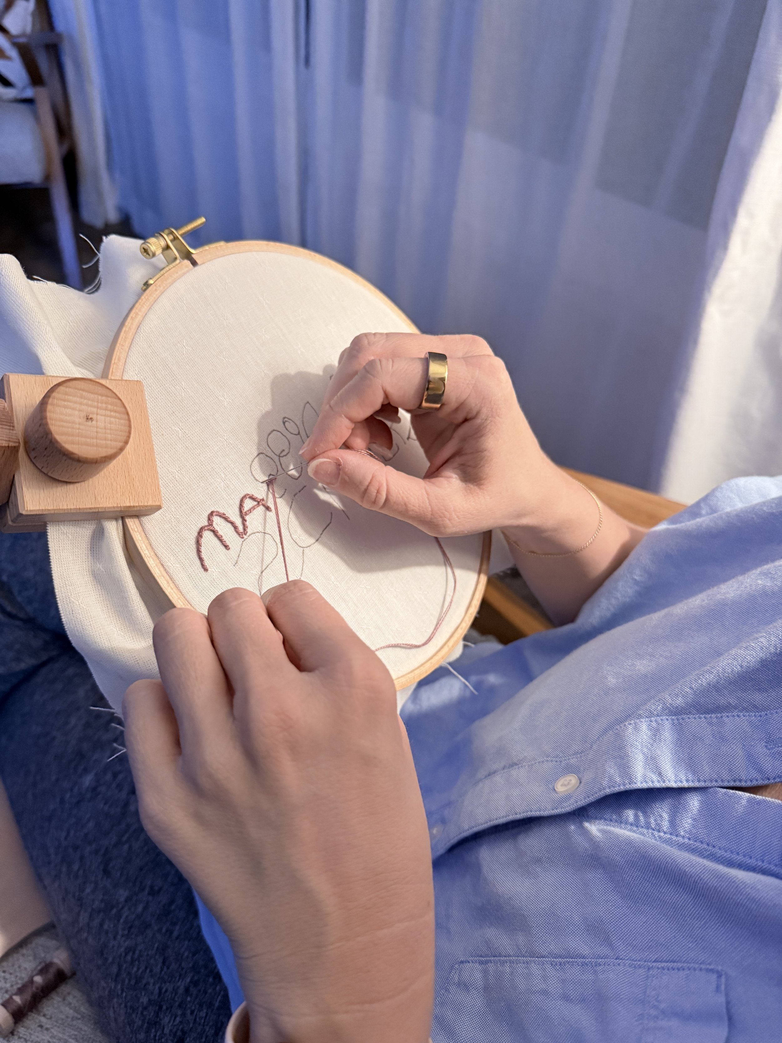 I traced the signature onto fabric using my iPad as a lightbox and a Frixion heat erasable pen. Then, using a hoop, I embroidered her name with Aurifil Cotton 8wt 2566 Wisteria thread using the stem stitch.