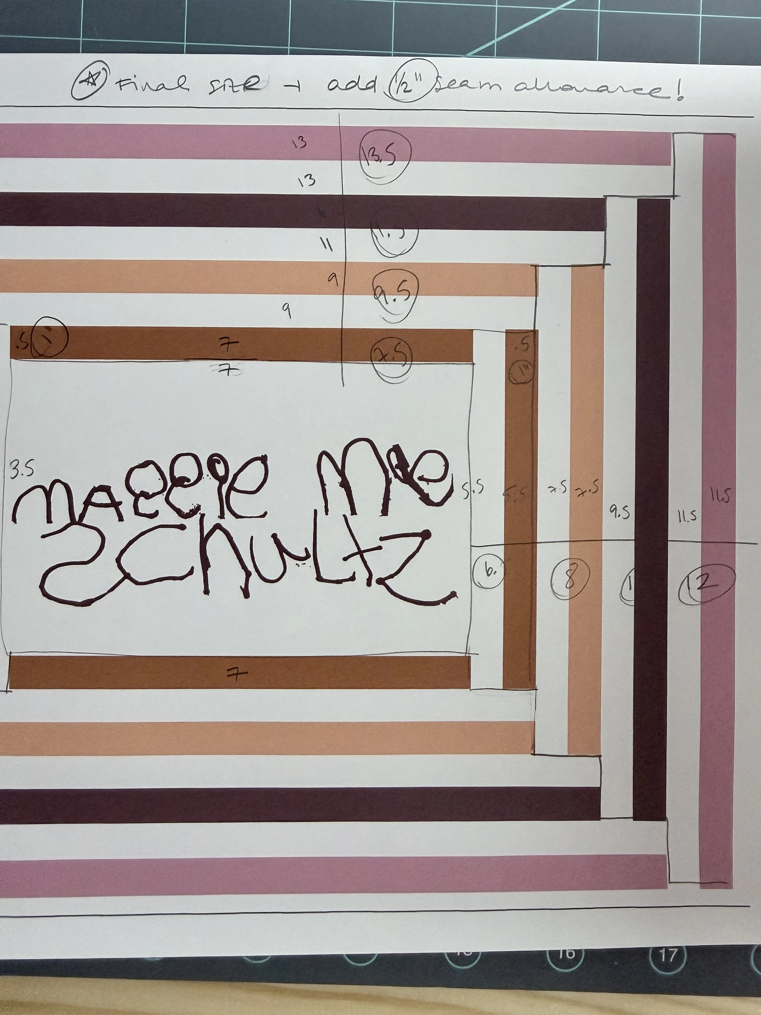 I designed the block in Adobe Illustrator, building concentric rectangles around Maggie's embroidered name as the center focal point. The idea was to frame her signature with layers of color that draw your eye inward.