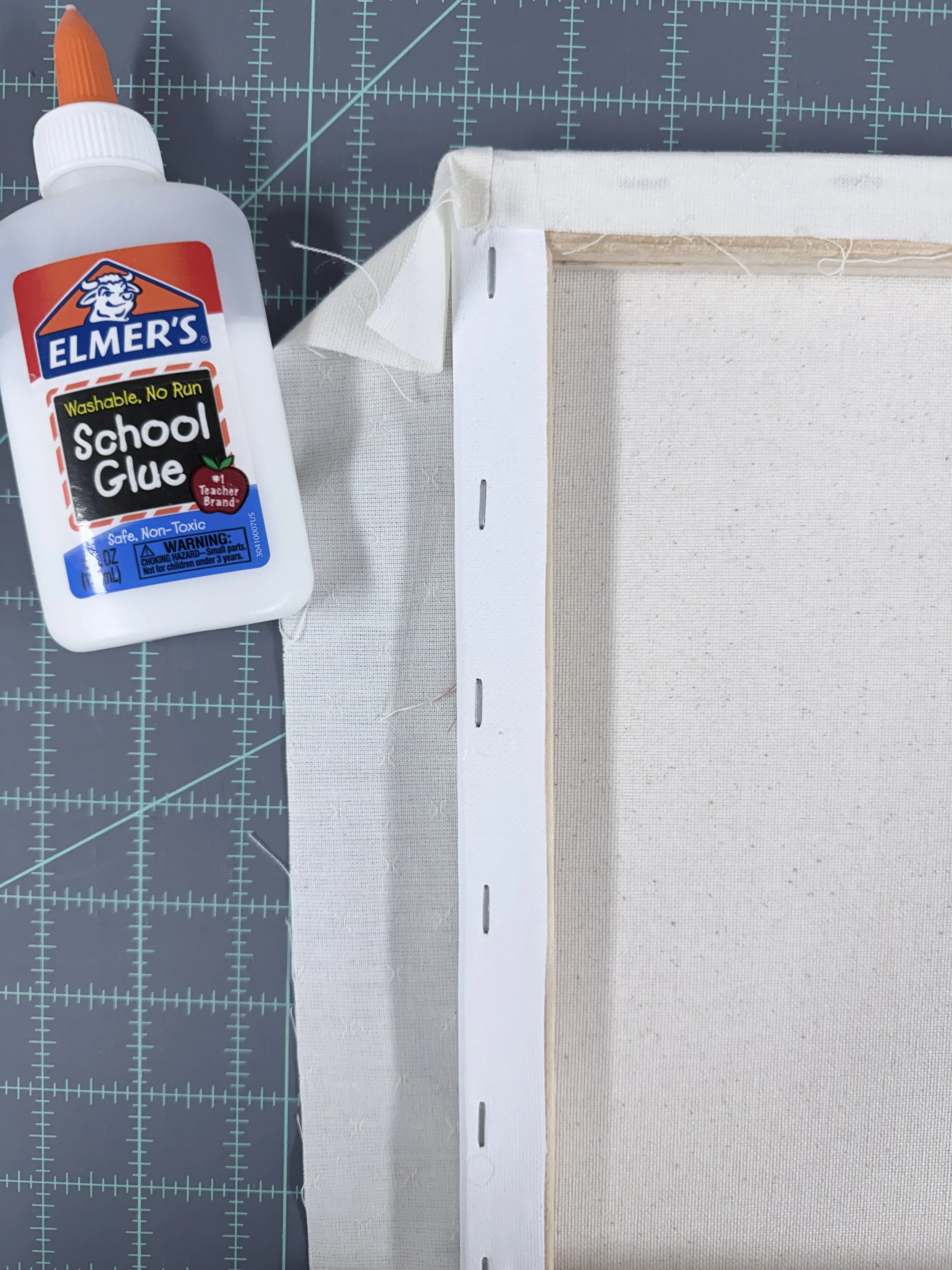 I used Elmer's washable glue to adhere the quilt to the canvas. Tip: make sure you spread the glue before placing the fabric down. This helps get rid of any visible glue lines that might show through once everything dries.
