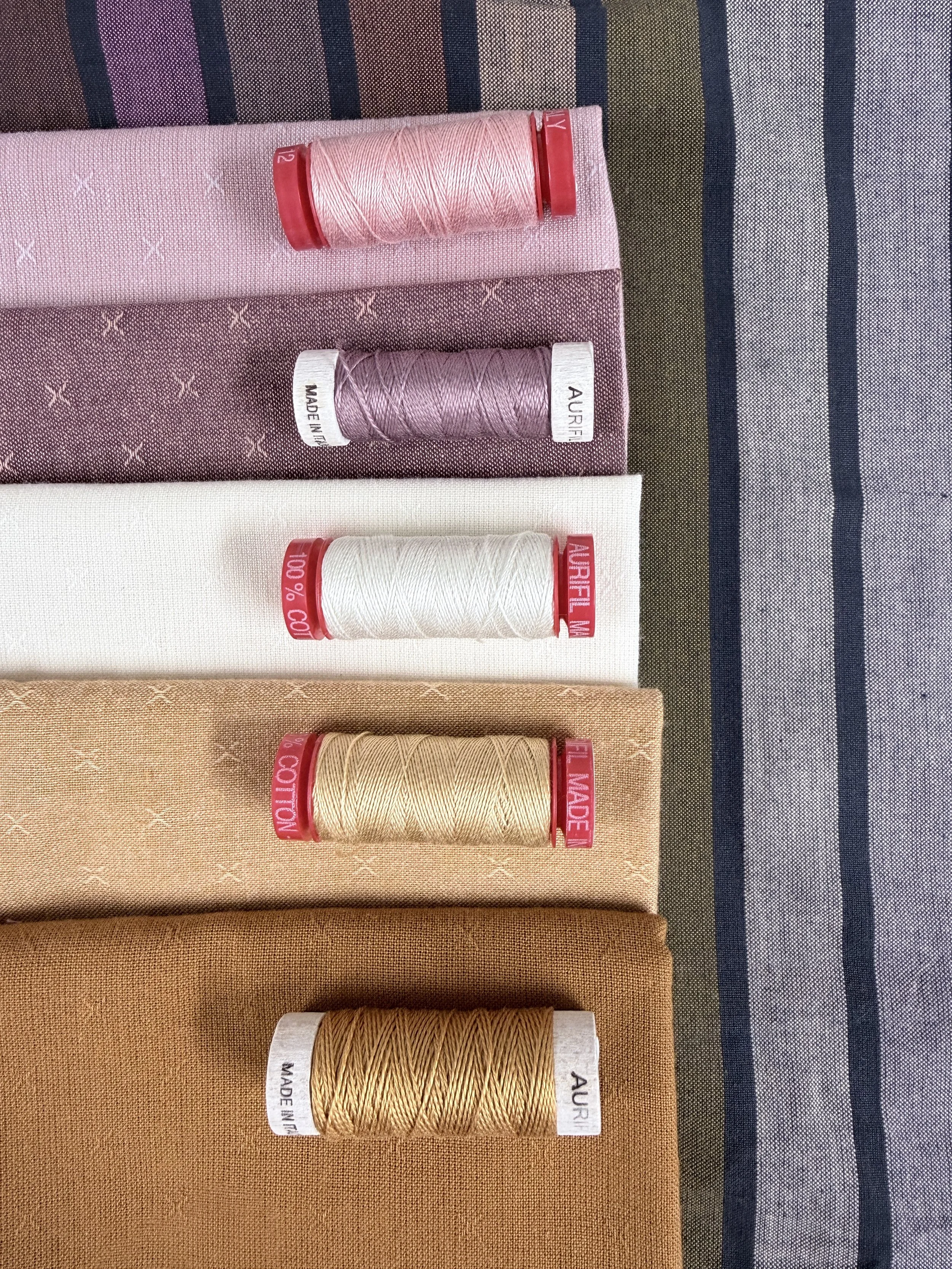 Aurifil Cotton 8wt 2930 Golden Toast, 12wt 2318 Cashmere, 8wt 2566 Wisteria, 12wt 2437 Light Peony, 12wt 6722 Sea Biscuit, and 40wt 2600 Dove (piecing).