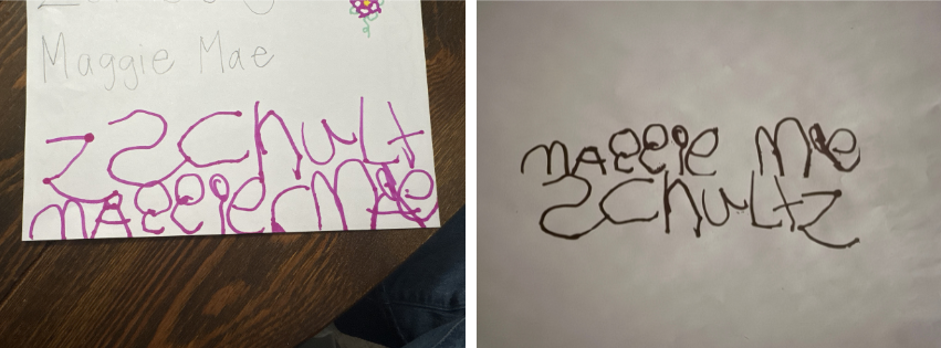 I asked my sister to send me a photo of Maggie's signature. From there, I scanned it and vectorized it to clean things up. There were a few fun little quirks in the original that weren't part of her normal handwriting, so I cleaned those up and printed the version I was going to work from.